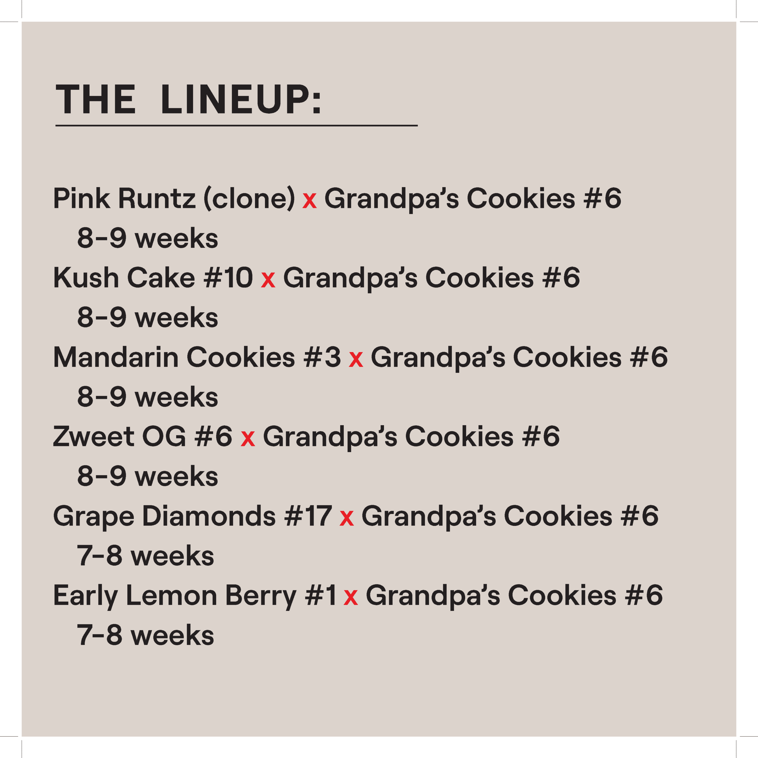 This pack features crosses made with the new House Favorite: Grandpa’s Cookies #6. Fast-flowering and fast-breeding, Grandpa’s Cookies #6 is a super resinous and terpy flower with shockingly few leaves and great density. Everything she hits in this cross is done between 50-63 days indoors and early season outside.